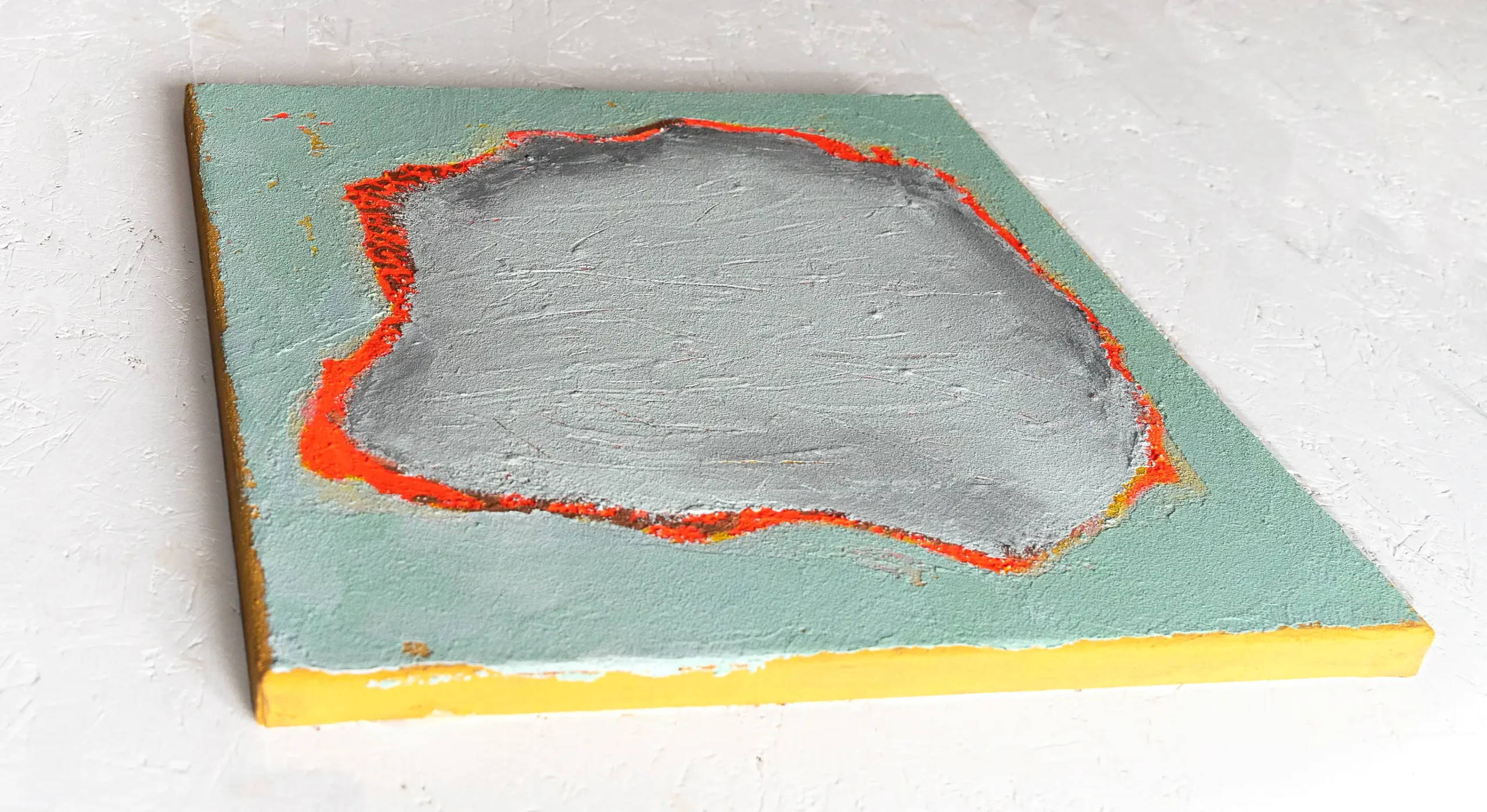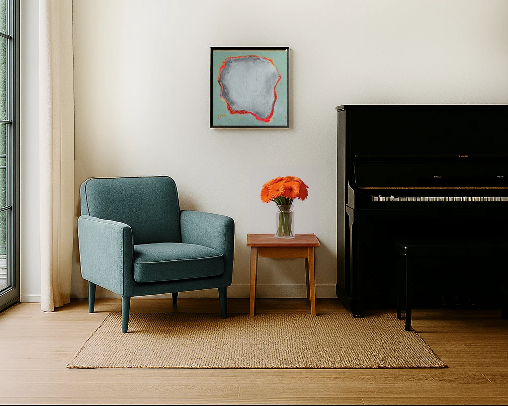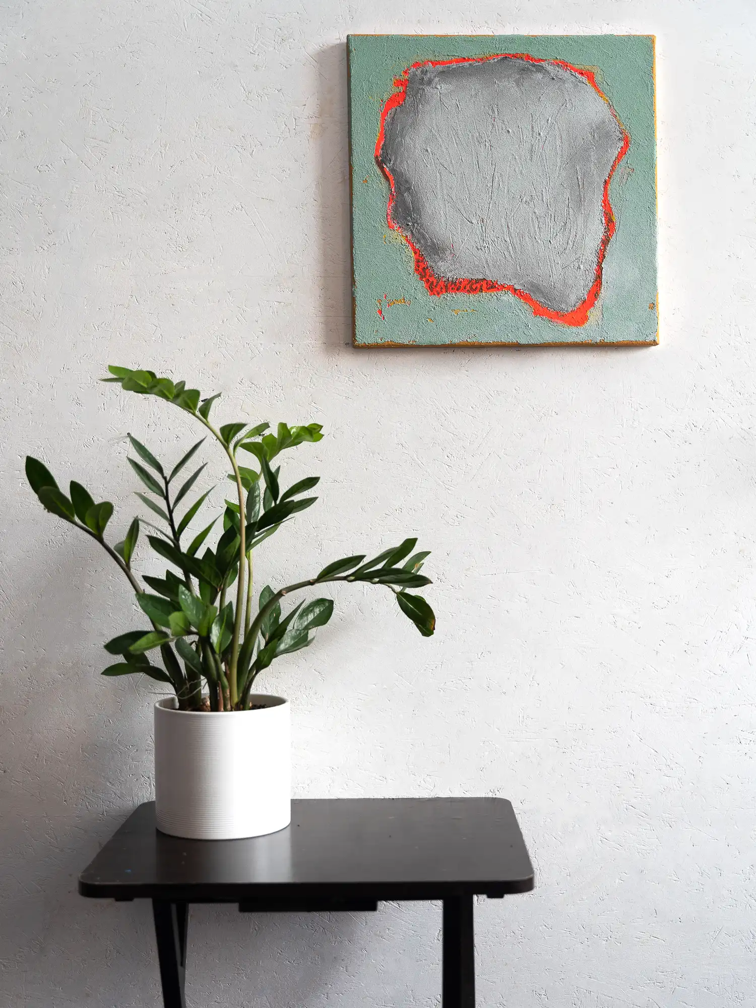 In dieser Serie habe ich mich für ein quadratisches Format entschieden – 40 × 40 cm, entsprechend der Größe des Keilrahmens. Das Bild ist hängfertig und kann direkt mit der Kante des Keilrahmens an einem Nagel an der Wand befestigt werden.