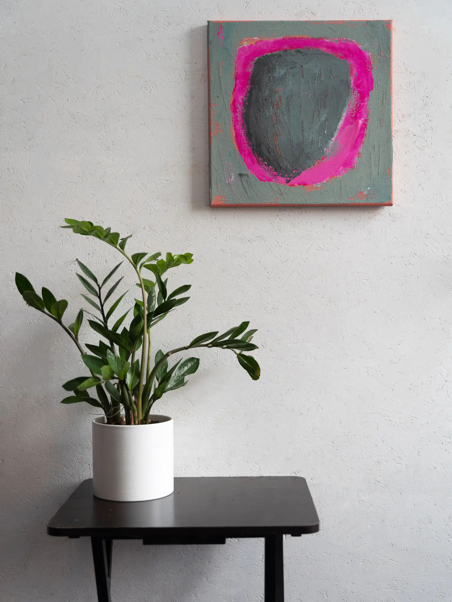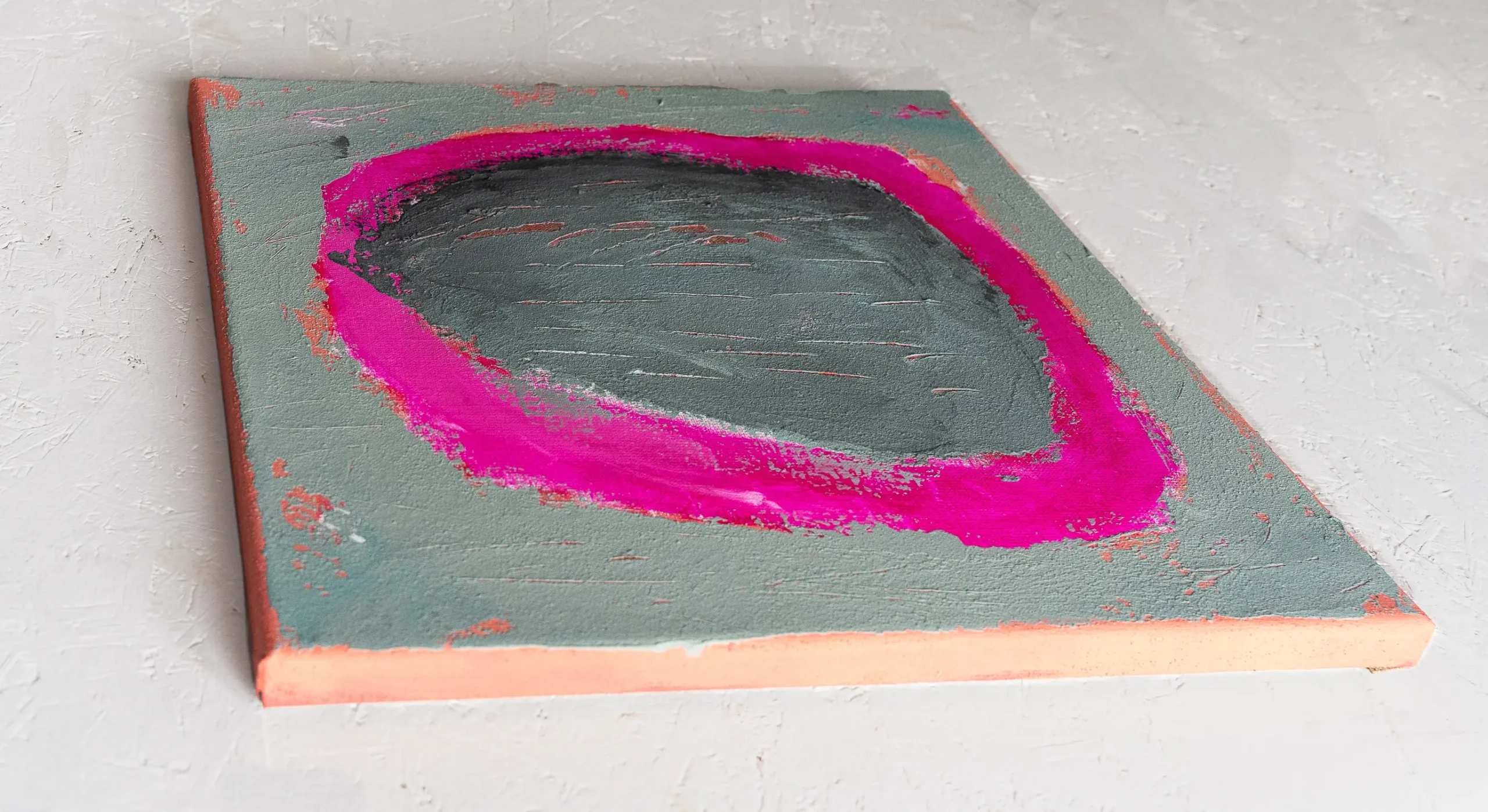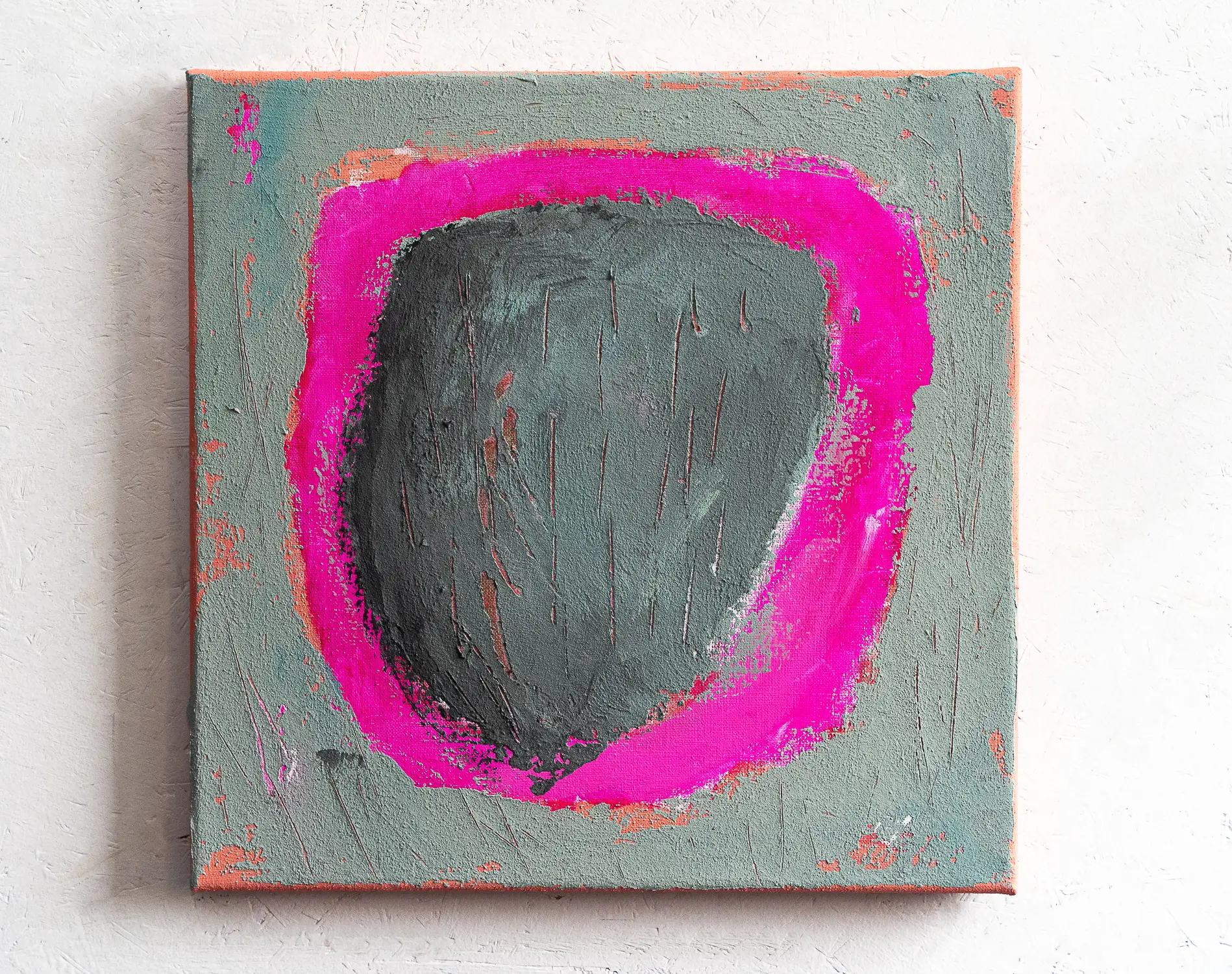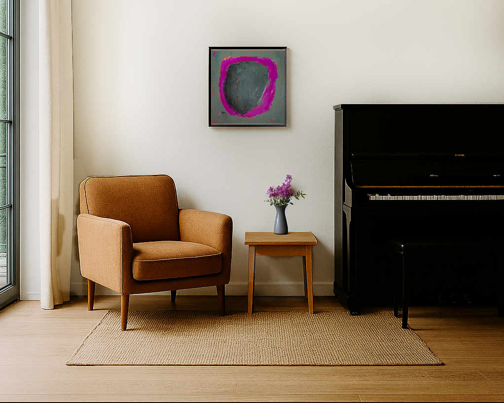 In dieser Serie habe ich mich für ein quadratisches Format entschieden – 40 × 40 cm, entsprechend der Größe des Keilrahmens. Das Bild ist hängfertig und kann direkt mit der Kante des Keilrahmens an einem Nagel an der Wand befestigt werden.