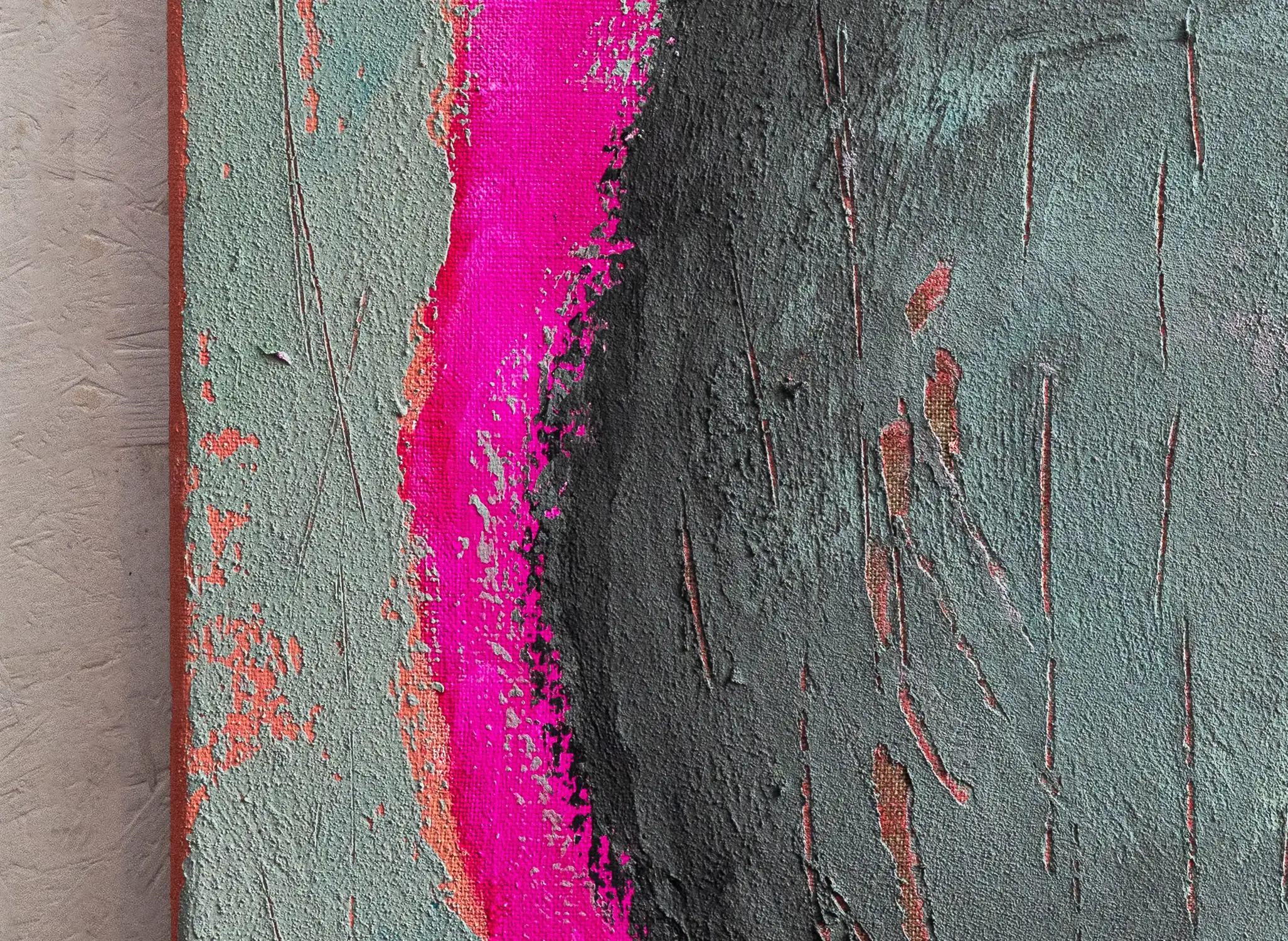 Dieses Gemälde wurde auf einer mit Gesso und Strukturpaste vorbereiteten Leinwand ausgeführt. Diese Grundlage bereichert die Oberfläche, verleiht ihr eine taktile Qualität und lässt die Farben anders schwingen, als wenn direkt auf die Leinwand gemalt würde.