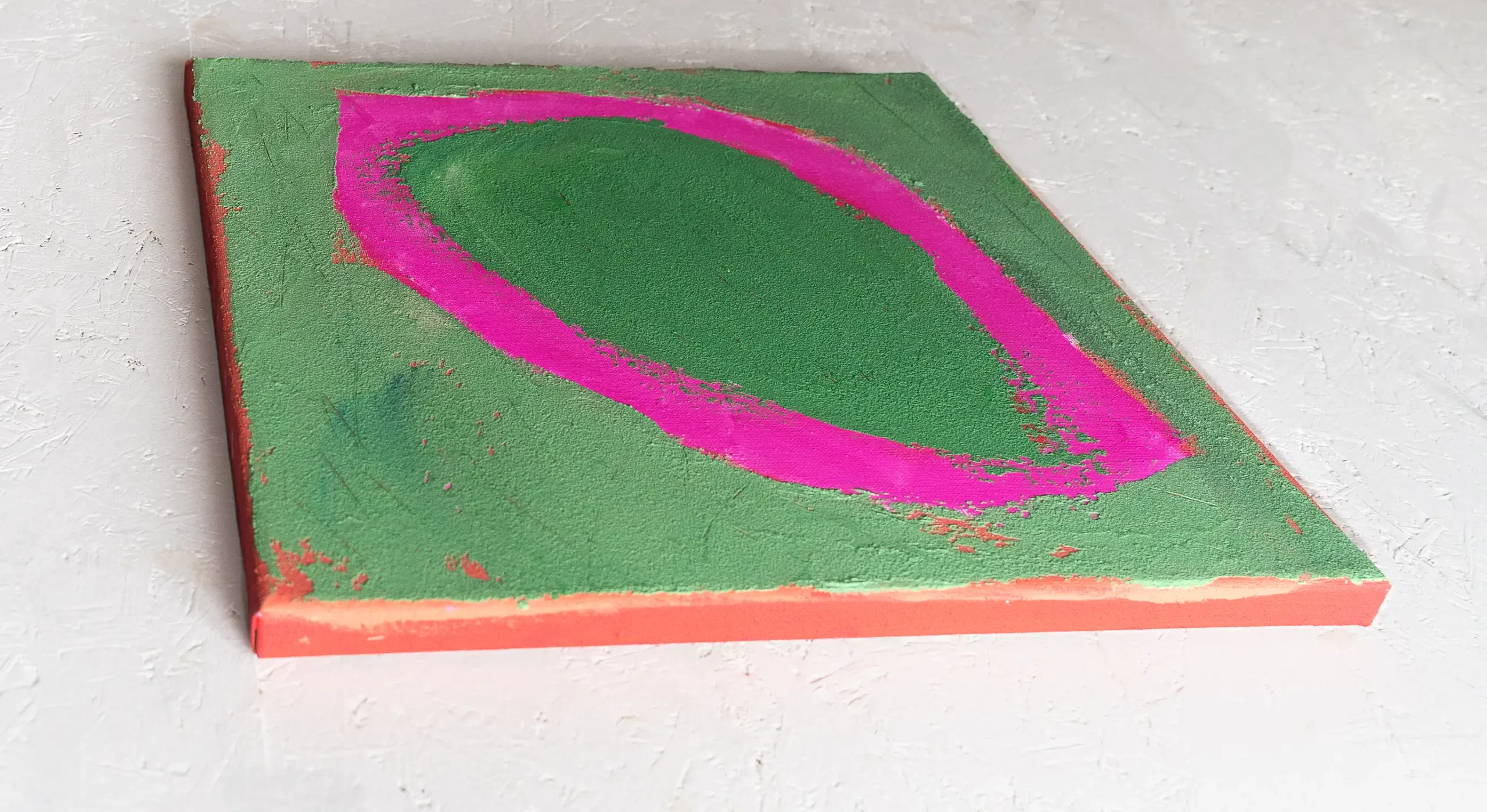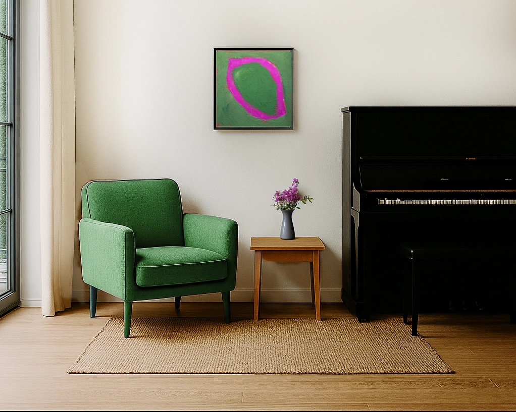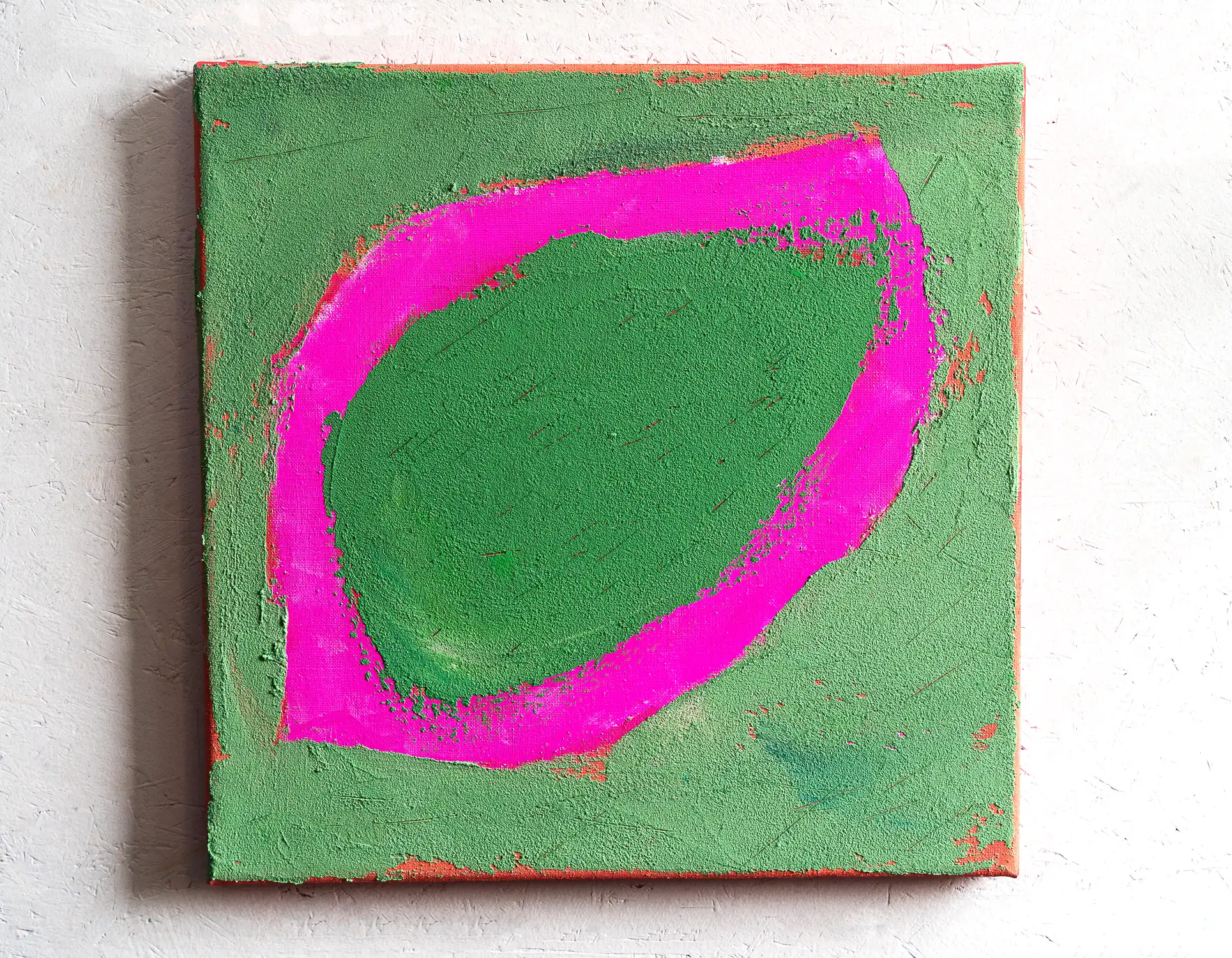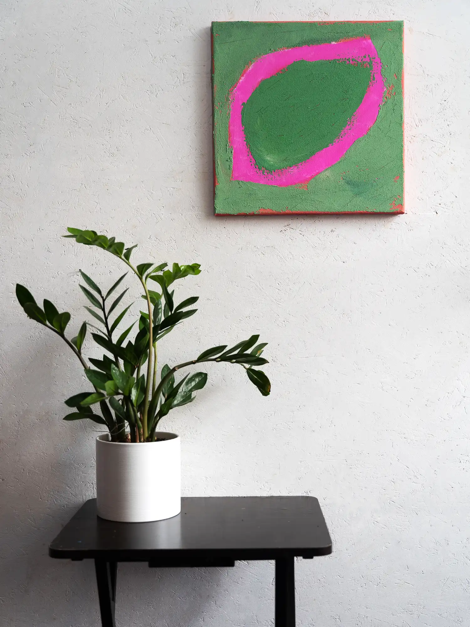 In dieser Serie habe ich mich für ein quadratisches Format entschieden – 40 × 40 cm, entsprechend der Größe des Keilrahmens. Das Bild ist hängfertig und kann direkt mit der Kante des Keilrahmens an einem Nagel an der Wand befestigt werden.