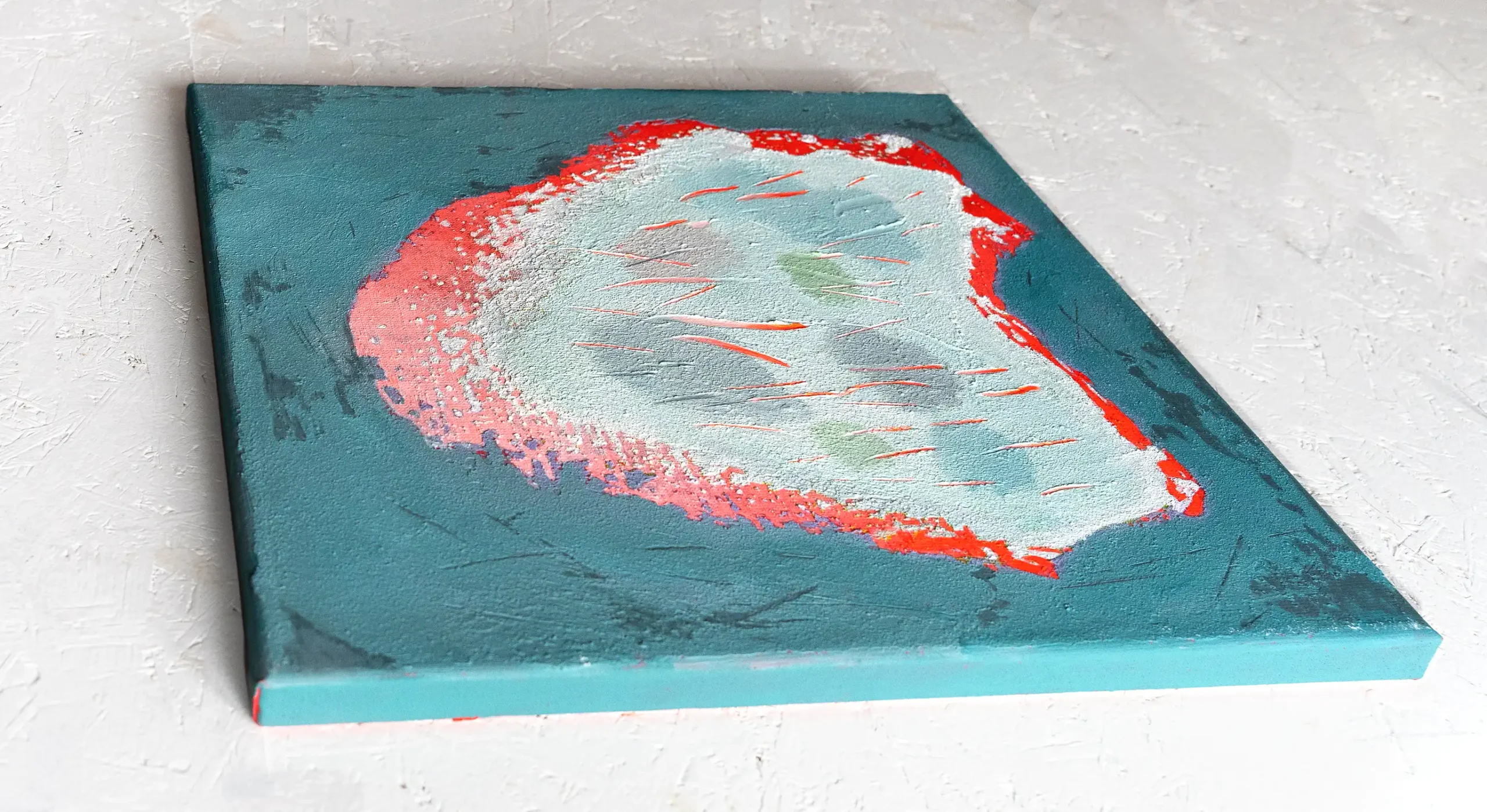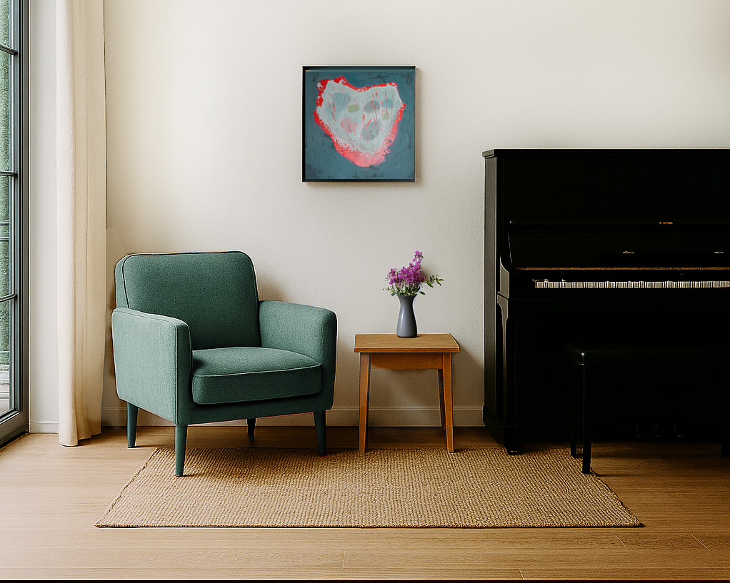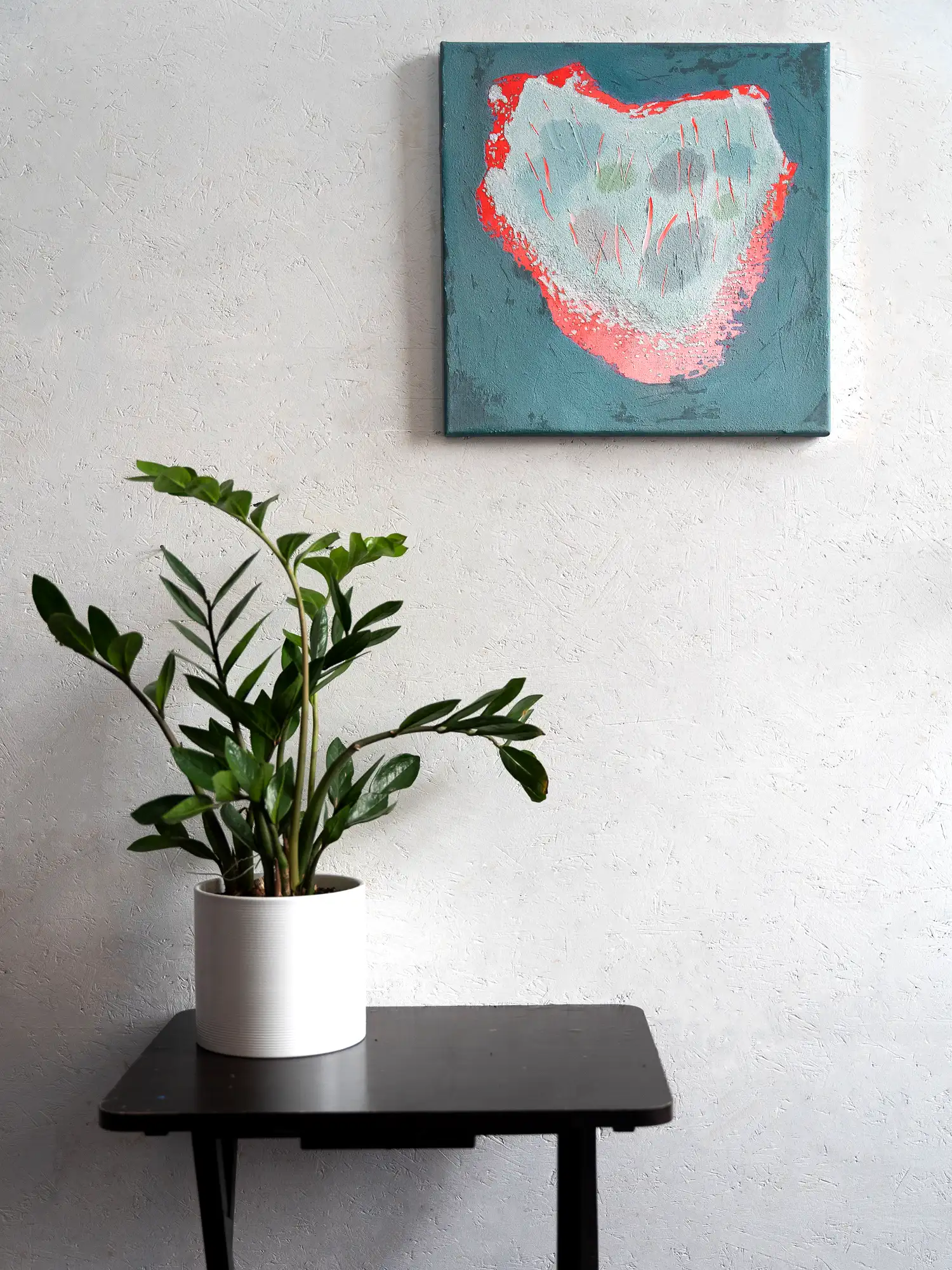 In dieser Serie habe ich mich für ein quadratisches Format entschieden – 40 × 40 cm, entsprechend der Größe des Keilrahmens. Das Bild ist hängfertig und kann direkt mit der Kante des Keilrahmens an einem Nagel an der Wand befestigt werden.