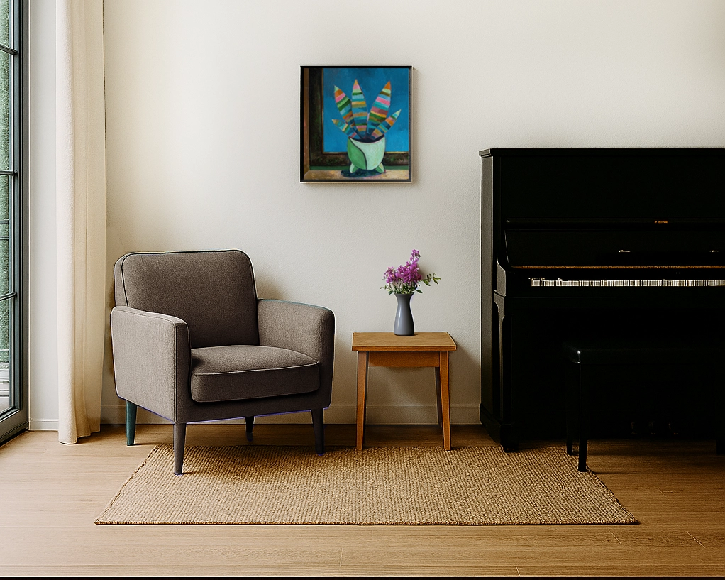 Von 2022 bis 2024 habe ich die Serie Sansevierien am Fenster entwickelt. Zunächst arbeitete ich mit Acryl auf Leinwand, später entstanden auch einige Drucke in Linolschnitttechnik.
