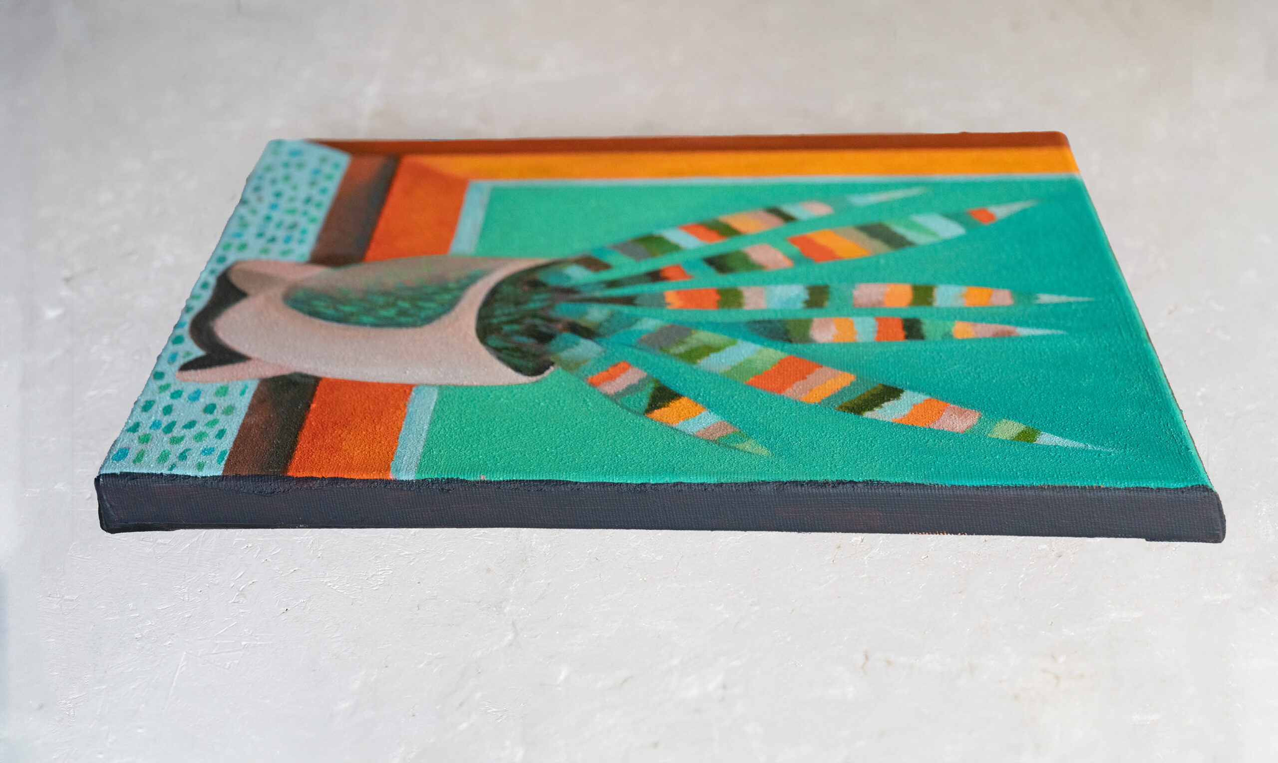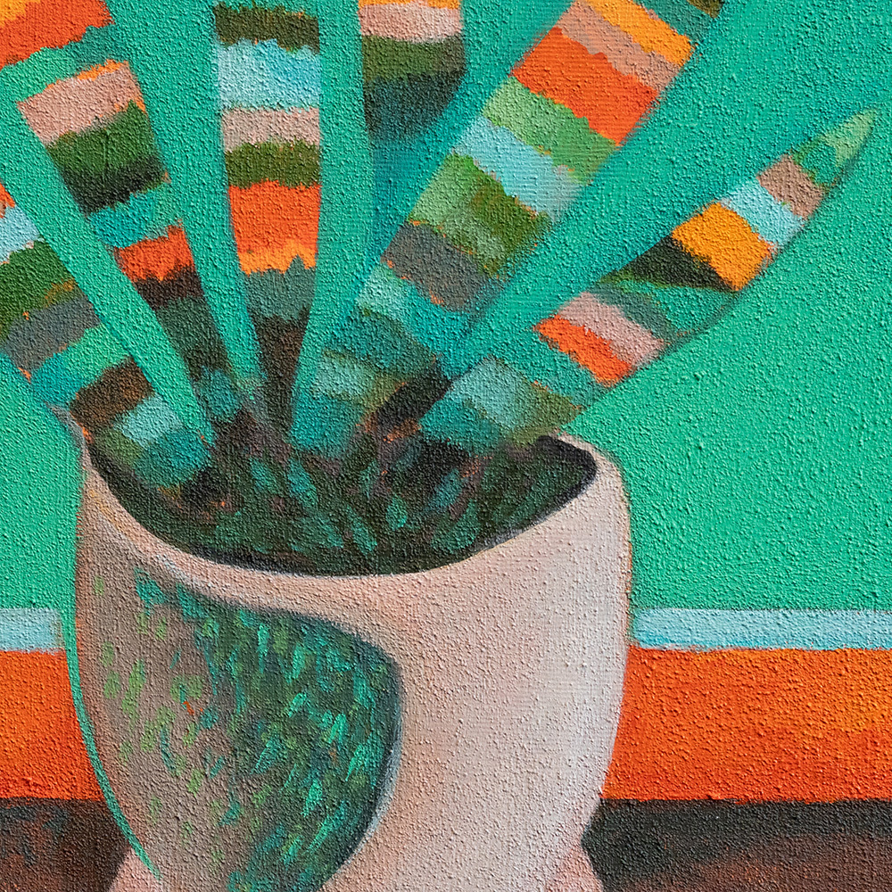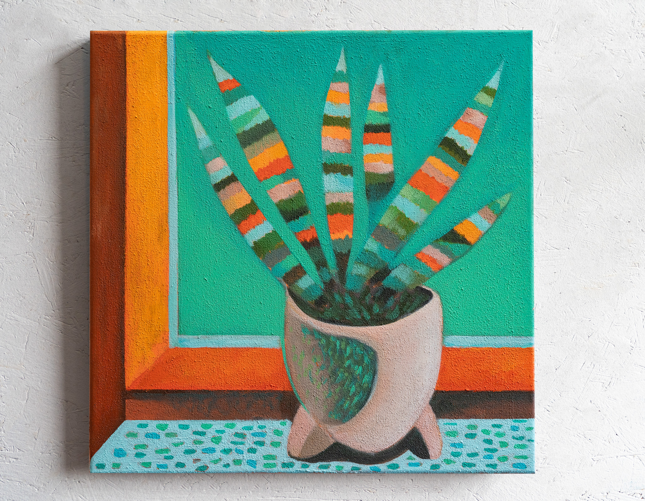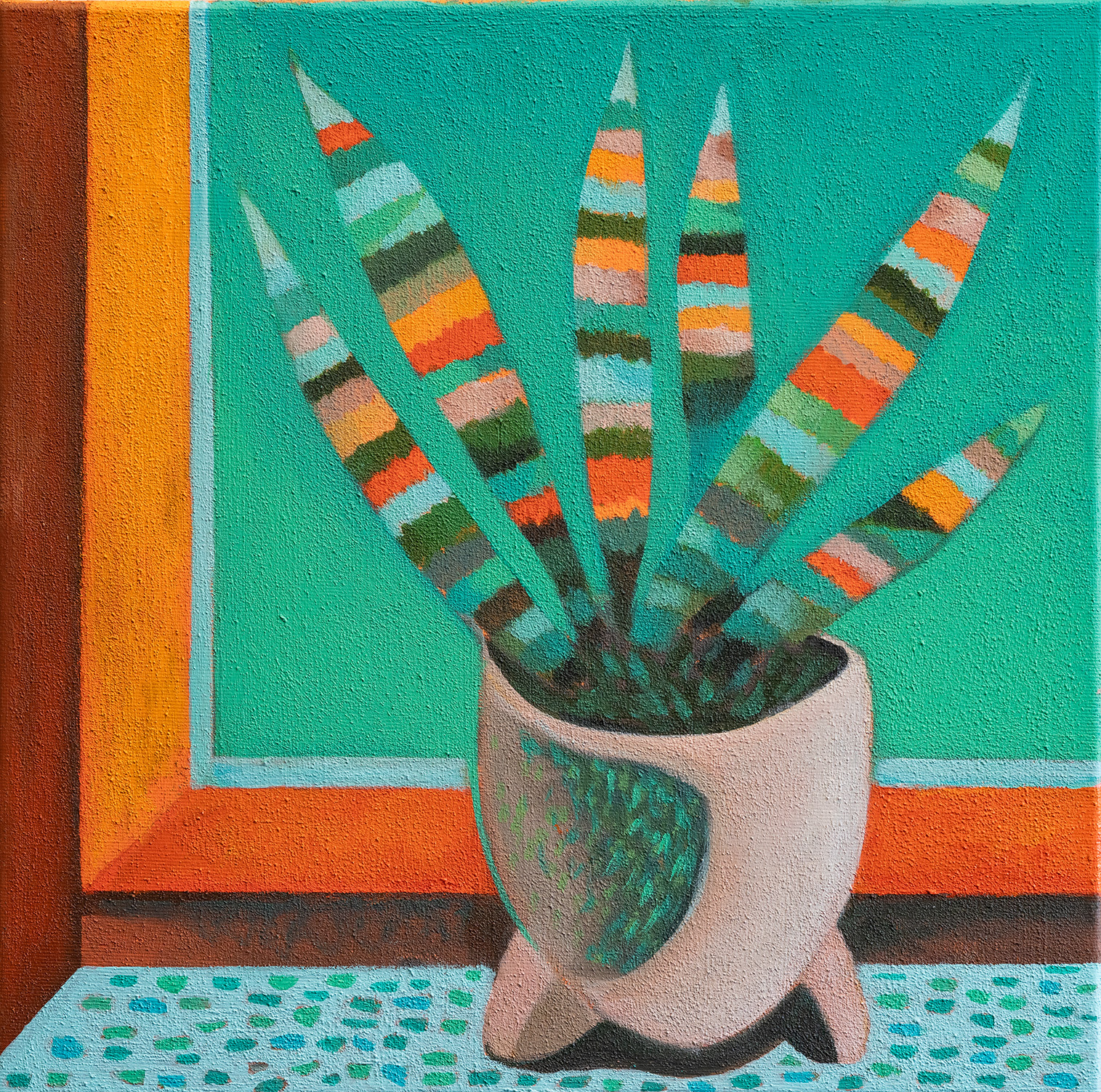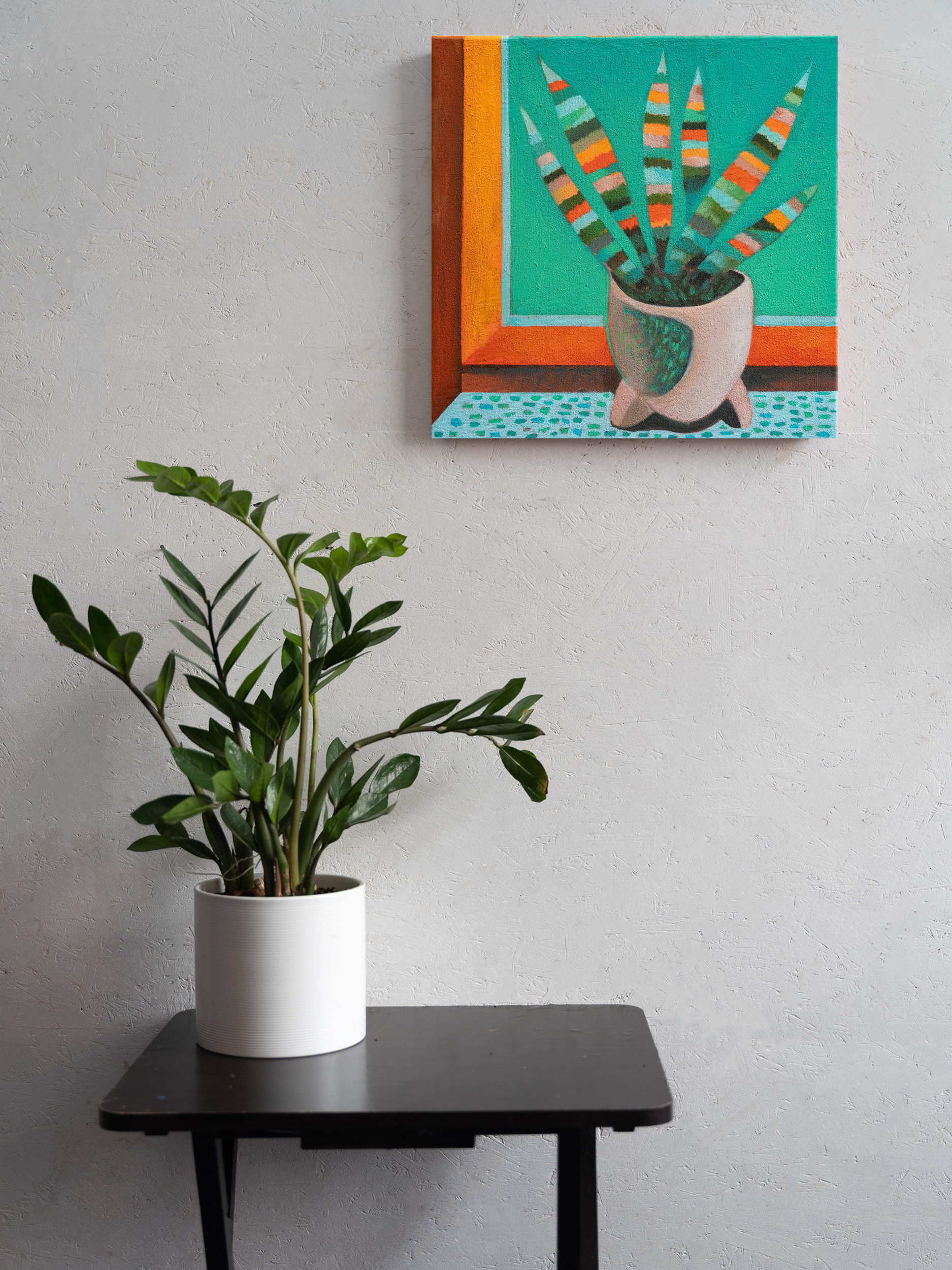 Sansevieria mit orangem Fenster, Acryl auf Leinwand, 40x40cm, 2024