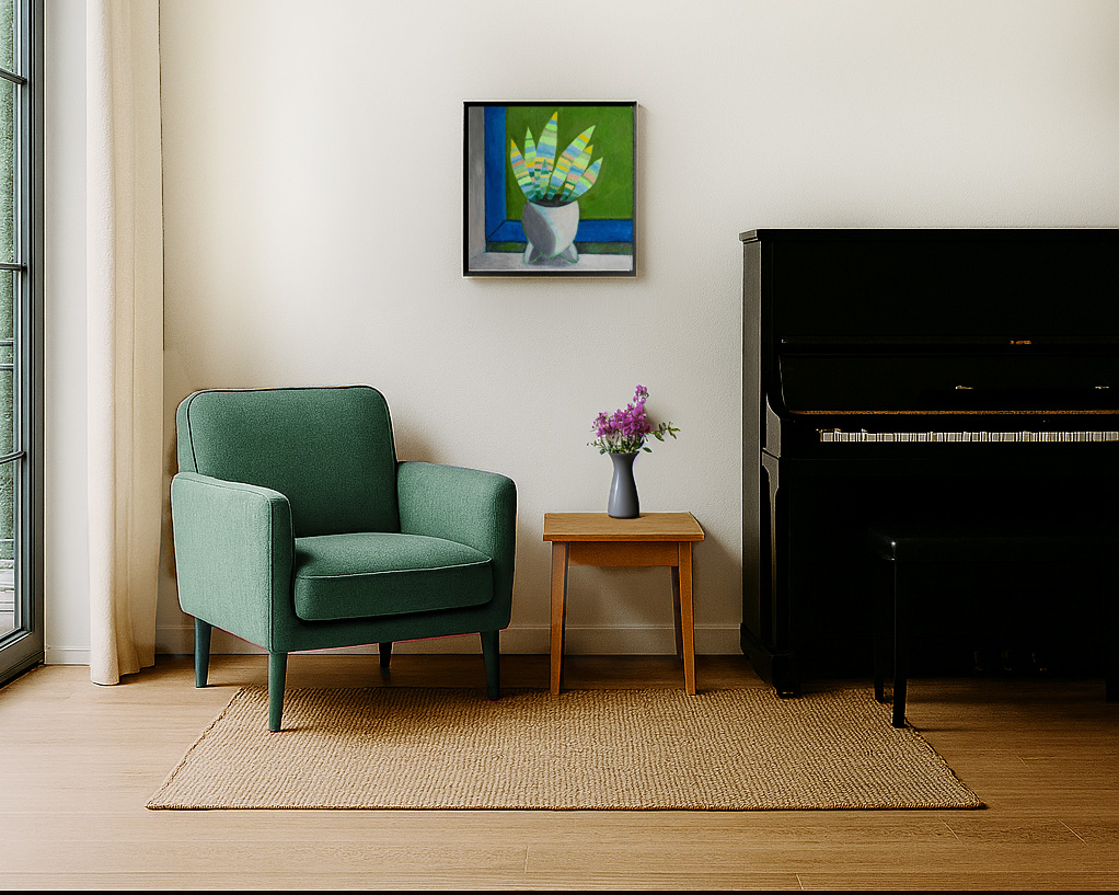 Diese Arbeit wurde in der Technik Acryl auf Leinwand ausgeführt und gehört zur Serie „Sansevierien am Fenster“. Die Maße betragen 40 × 40 cm. Das Gemälde ist ein Unikat und wird hängfertig geliefert. Ein Rahmen ist nicht enthalten.